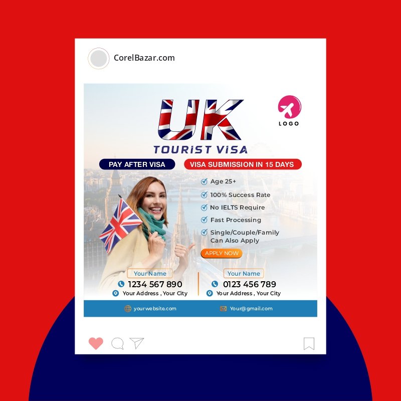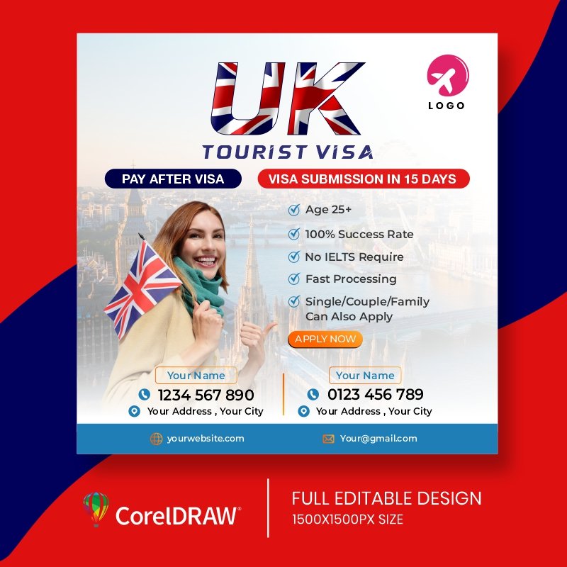 Introducing our UK Tourist Visa Post CDR Design Template, meticulously crafted to enhance your promotional materials. This editable CDR file offers a variety of captivating designs, ideal for creating compelling posts about obtaining a UK Tourist Visa. Customize layouts and graphics effortlessly to emphasize the benefits of visiting the UK. With our Study in UK Tourist Visa CorelDraw Design Template, elevate your marketing efforts and captivate your audience. Transform your promotional strategies with Corel Bazaar’s premium design templates, tailored to make your posts stand out.